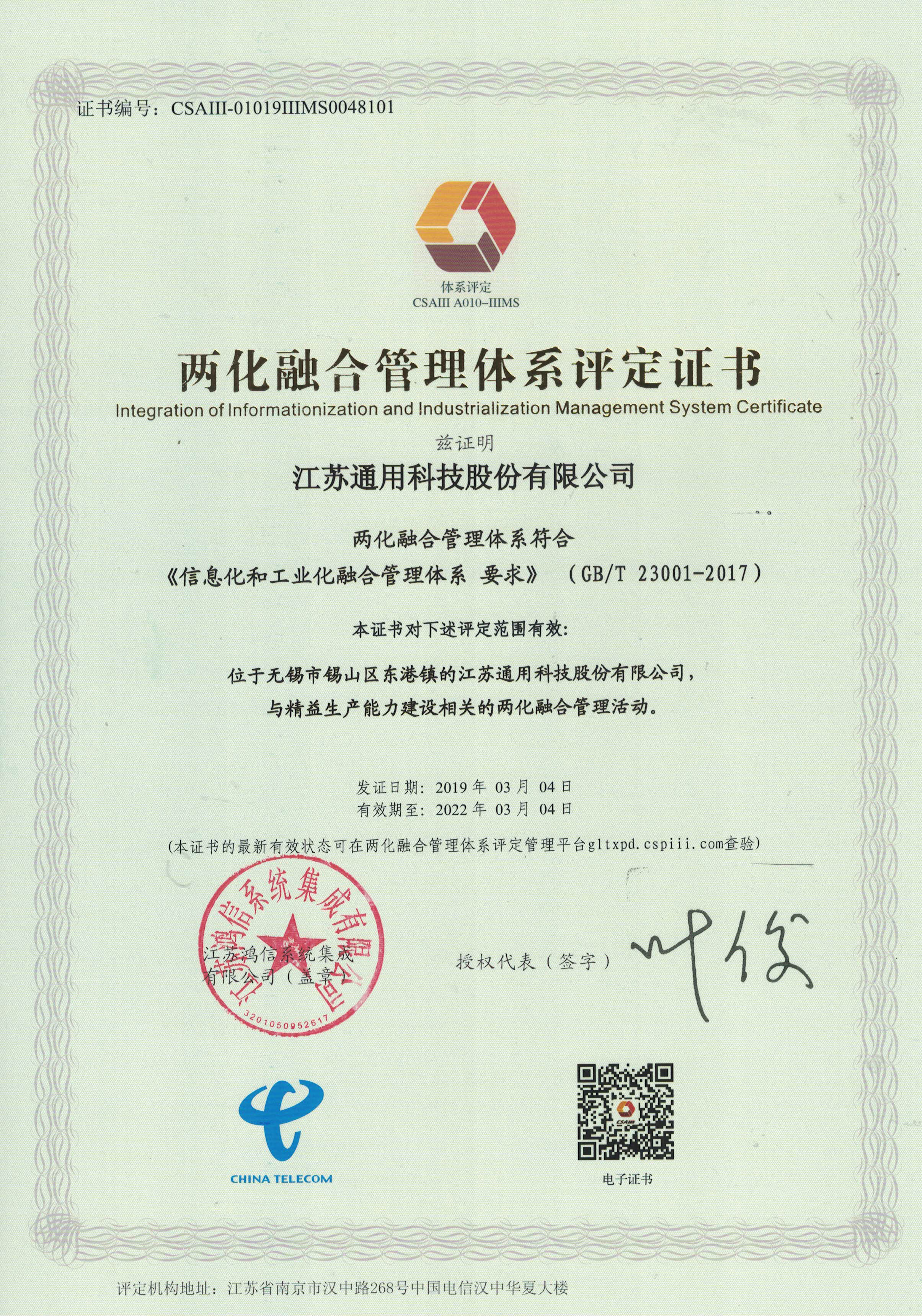 近日,通用股份順利通過國家兩化融合管理體系評定并獲得證書,評定范圍是與精益生產(chǎn)能力建設(shè)相關(guān)的兩化融合管理活動(dòng),標(biāo)志著公司在推