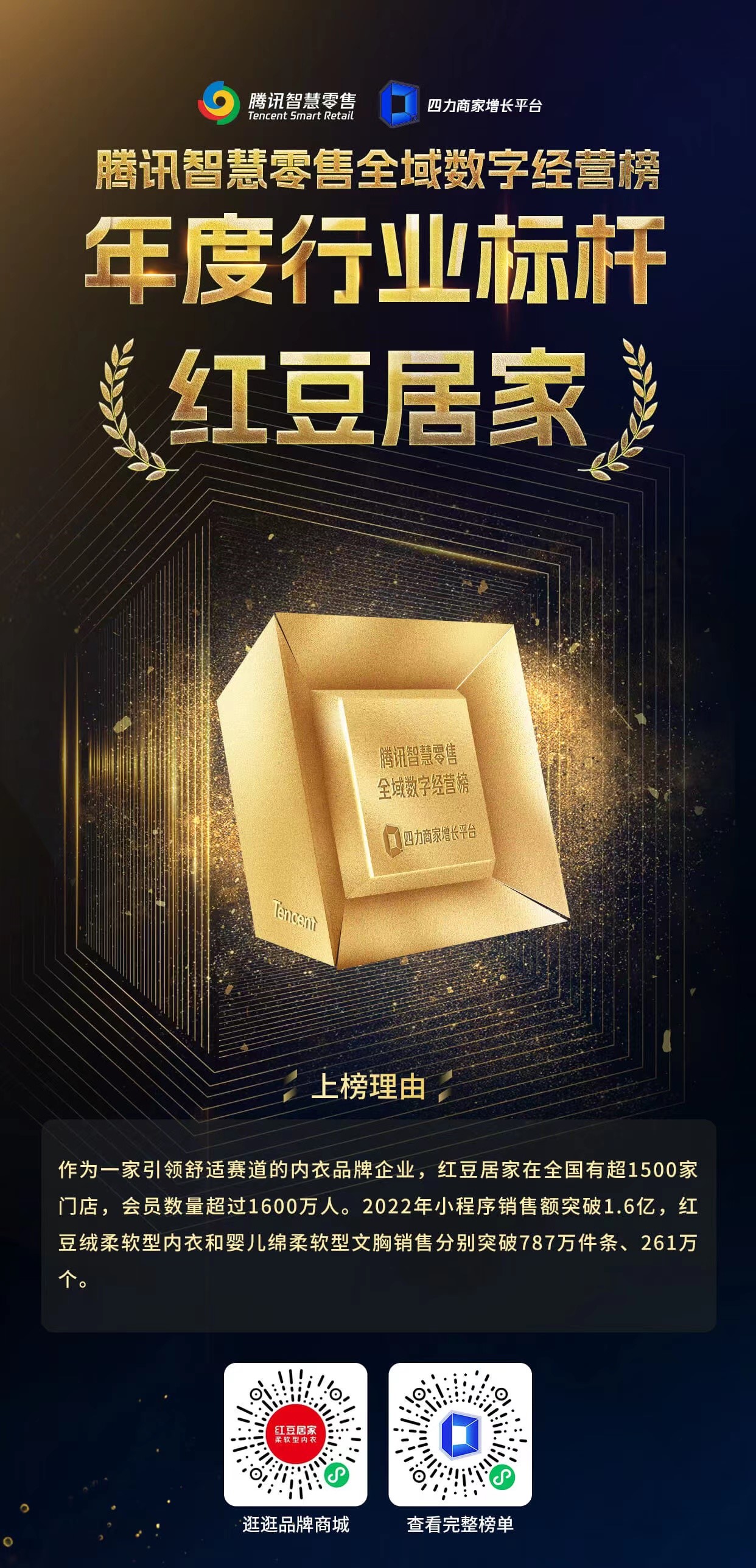 近日,由騰訊聯(lián)合《哈佛商業(yè)評論》中文版及多領(lǐng)域?qū)<遥笾腥A區(qū)艾菲等頭部機構(gòu)聯(lián)袂推薦,2022騰訊智慧零售全域數(shù)字經(jīng)營榜發(fā)布。紅豆居家憑