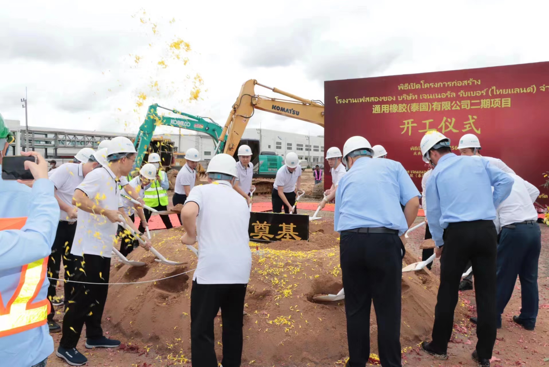 隨著各位領導共同完成“第一鏟土”,現場禮花滿天、禮炮齊鳴,奠基儀式圓滿落成,標志著通用橡膠泰國公司二期項目正式起航。